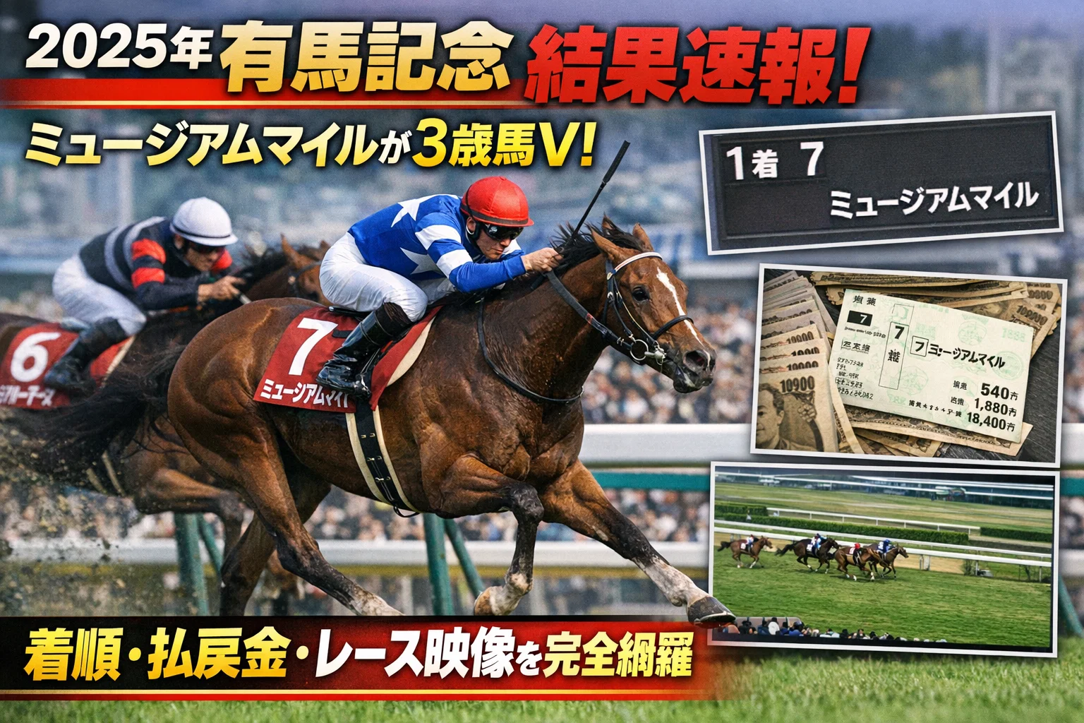 2025年12月28日に中山競馬場で開催された第70回有馬記念は、3歳馬ミュージアムマイルがC.デムーロ騎手とのコンビで優勝を飾りました。連覇を狙った1番人気レガレイラは4着に終わり、波乱の決着となりました。この記事では、最新のレース結果、払戻金、着順、レース映像など、有馬記念の全情報を詳しく解説します。