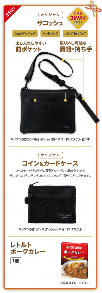 2026年版のココイチ福袋は、日常使いしやすいバッグ系グッズ+レトルトカレー+お食事補助券の構成です。