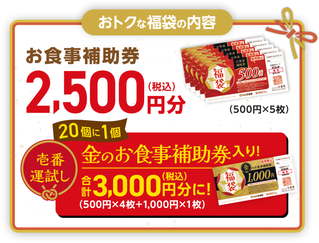 | 2026 | 2,500円 | 1回(12/26〜なくなり次第) | サコッシュ+コイン&カードケース | 2,500円分(500円×5枚) | 20個に1個で3,000円分の「金のお食事補助券」 | 1人10個まで | 有効期限:2026/1/1〜5/31 |