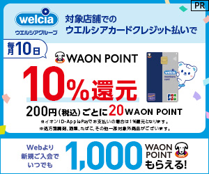 ウエルシアカードの新規入会でWAON POINTが1,000ポイント、更に指定額以上の利用で抽選で最大10万ポイントが当たります。