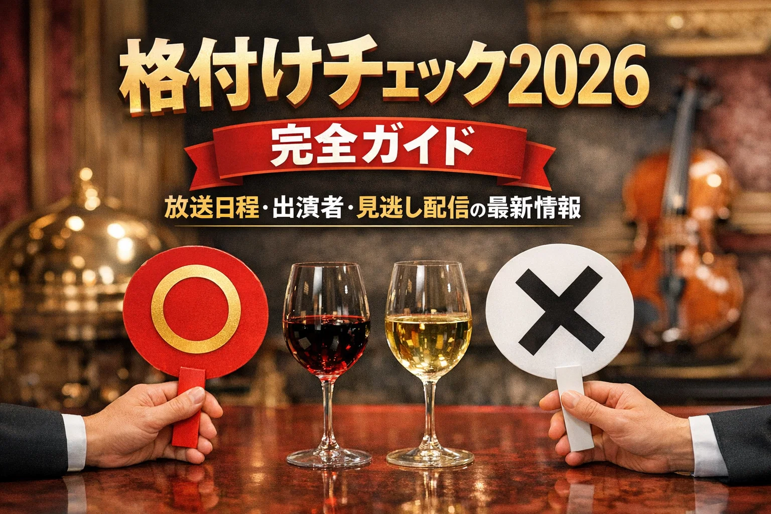 「芸能人格付けチェック2026」は、2026年1月1日(木・祝)午後5時から4時間にわたって放送されます。GACKTの連勝記録更新への挑戦や、豪華出演者による一流品の見極め対決、そして番組史上最高額102億円超の弦楽八重奏など見どころ満載です。放送後はTVerで無料配信、TELASAで過去シリーズも視聴可能です。