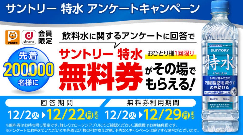 ローソンアプリの「サントリー特水アンケートキャンペーン」は、簡単なアンケートに答えるだけで税込162円の特水600mlが無料でもらえる非常にお得なキャンペーンです。先着20万名限定のため、早期終了する可能性が高く、今すぐアプリから参加することをおすすめします。