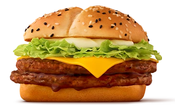 昨年も人気だった復活メニューです。2枚のポークパティを甘辛いてりやき風味のソースと絡め、コクのあるチェダーチーズとレタスをサンドしています。今回はドラクエバーガー専用のオリジナルバンズで提供され、特別感が増しています。