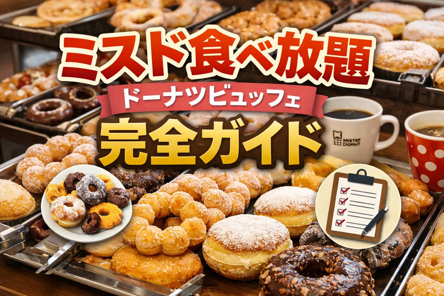 ミスド食べ放題(ドーナツビュッフェ)の2026年2月最新の実施店舗一覧!全国約100店舗を地域別にまとめ。料金2,000円で何個食べれば元が取れる?予約方法・ルール・攻略法も解説。