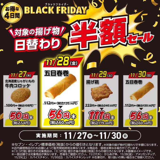セブンイレブンが初めてブラックフライデーセールを実施しています。このキャンペーンは「揚げ物日替わり半額セール」として、2025年11月27日(木)から11月30日(日)までの4日間限定で開催されています。