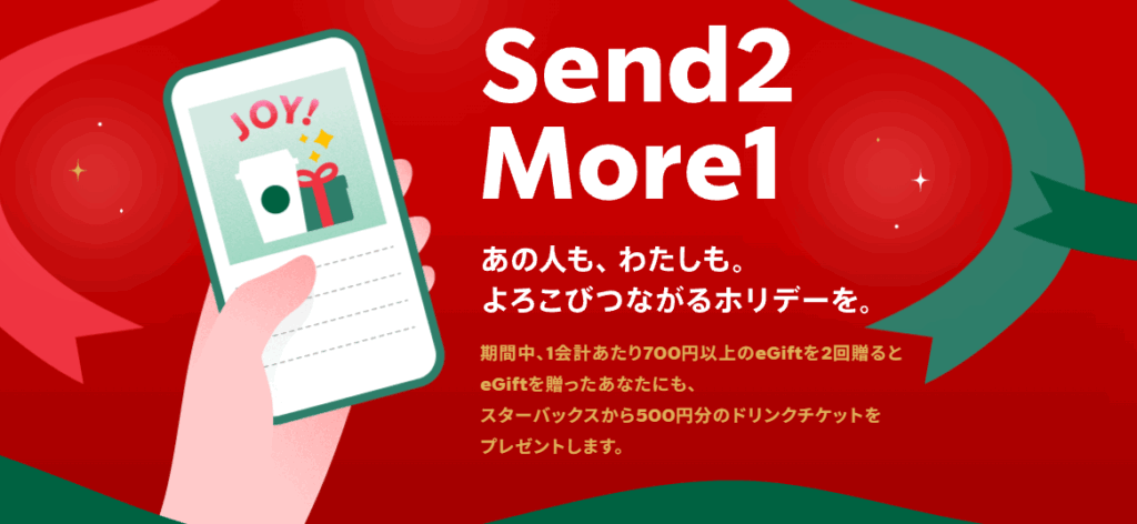 スターバックスのドリンクチケットは、種類が豊富で購入方法も多彩です。2025年12月現在実施中の「Send2 More1キャンペーン」では、700円以上のeGiftを2回贈ると500円分のチケットがもらえる先着10万枚限定のお得な企画が開催されています。