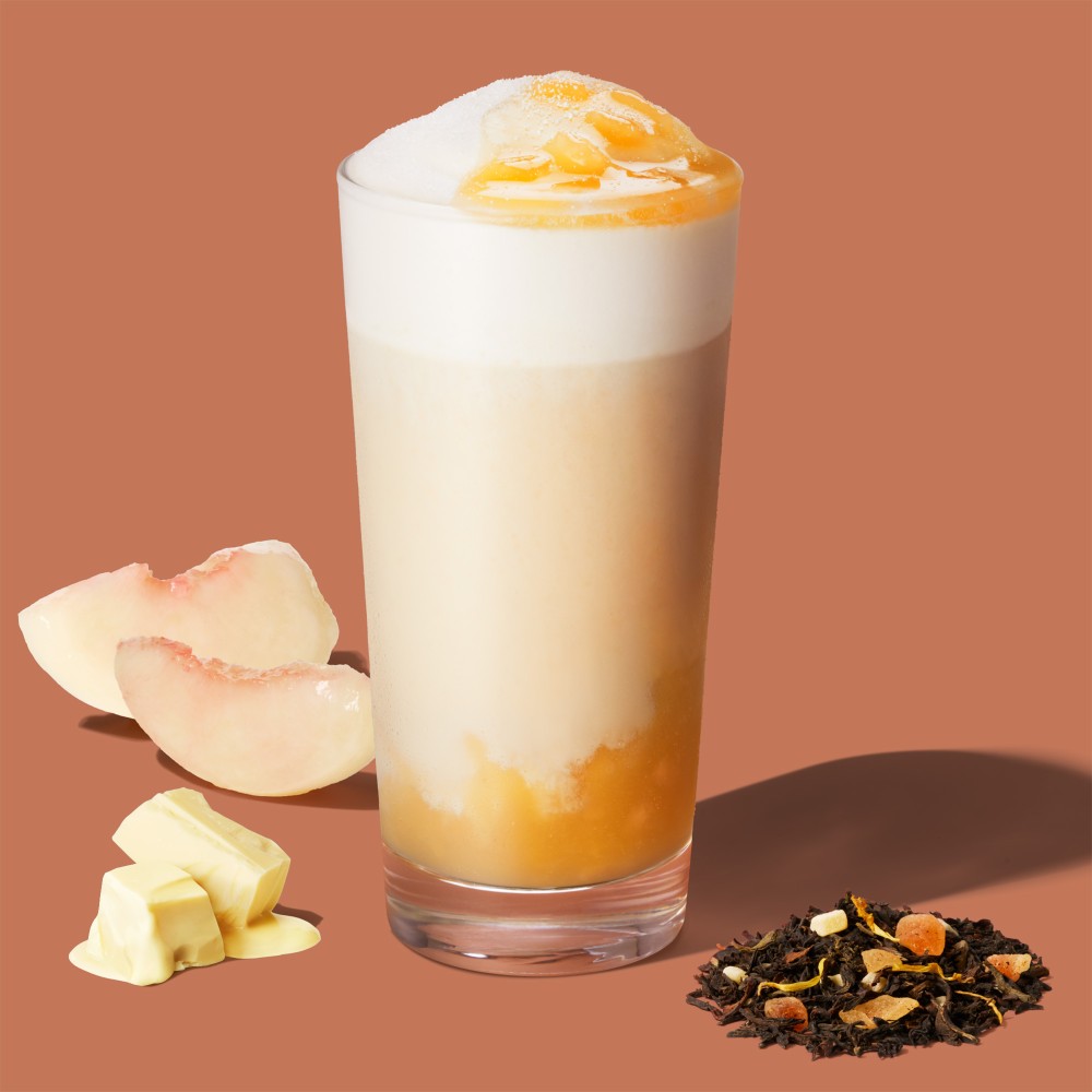 • 特徴:ふんわりとした口どけのティームースをトップにのせて、とろっとした甘さのホワイトピーチ果肉ソースとホワイトチョコレートパウダーで仕上げた一杯