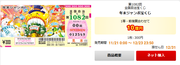 2025年の年末ジャンボ(第1082回)は12月23日(火)23:50まで購入可能です。1等・前後賞合わせて10億円、2等も1億円に増額されたビッグチャンスを、ネット購入で逃さず手に入れましょう。